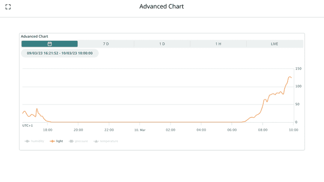 The advanced chart widget is used to display data from several Arduino Cloud variables in a single chart. You can track the data in both real time, select from a specific time period while selecting the variables you want to display.