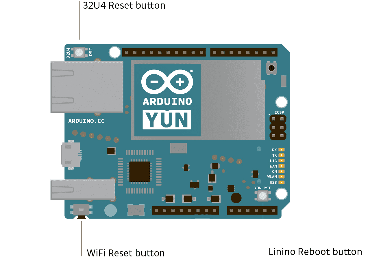To restart the AR9331, which reboots LininoOS, press the "YÚN RST" reset button that is close to the analog inputs pins and the LEDs of the board.